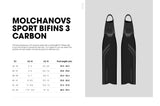 The Molchanovs SPORT Bifins 3 Carbon are premium long carbon blades paired with standard-size SPORT Silicone Foot Pockets. Designed for freedivers who train, teach, and fun dive in the pool and open water and require a lightweight and reactive carbon blade. Updates include a new blade-layering pattern for more impactful finning and size-graded stiffness for maneuverability. Anatomical silicone foot pockets make comfort a priority, along with rigid stabilizers for control over every kick and a unique energy transfer system for extra power in each movement.